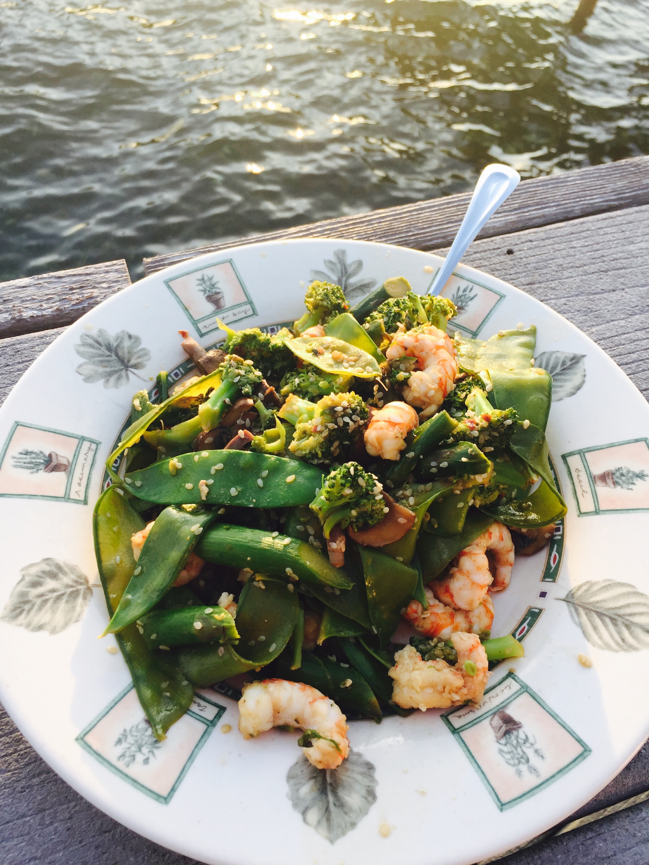 Today I was so busy I did not do a lot of thinking about food! Ahhhhh….that felt nice! I am still hungry a lot and I still get starvation pains but those only come when I really have not eaten in a long long long time. I continue to try to understand the difference between hunger and appetite. I bought my first pack of gum today and it tasted GLORIOUS and it did seem to help me keep my mind off of my hunger. I can feel some of my energy coming back…I am sleeping a bit better…and tonight I made our first menu that was not something “simple”! That felt really good and it tasted ever better. Sautéed FRESH Hood Canal shrimp with broccoli, snow peas, mushrooms, and asparagus!