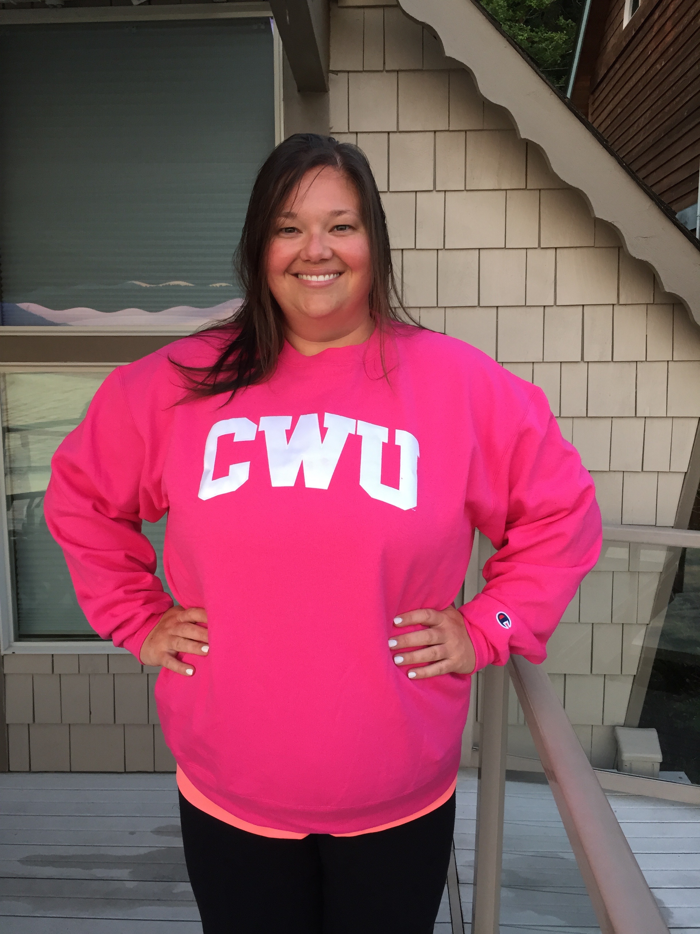 My cousin gave me a wonderful present this weekend. She made me a care package of sorts to help me along this journey. I went to Central Washington University just as her parents and her great-grandmother. That place just runs in the family. This package included a mini-marshmallow shooter (a way to play with food and not eat it- super smart!), crossword puzzle book to keep my mind occupied in moments of weakness, a delicious smelling candle, and a brand new CWU sweatshirt. This is significant for me…I was legendary at CWU in my prime. Every semester I bought a new sweatshirt or new sweatpants EMBLAZENED with the CWU logo. I lived in those things…I mean every day I was in a sweatshirt. Before or after work that was my attire. All my friends would make it a point to see me on book pick-up day to see what I had purchased then wait int he shadows to STEAL an old sweatshirt. CWU is also the place where I put on all my weight. I gained 70 pounds in the 7 years I was on campus. So its a mixed bag at the moment. I know why the weight came on…lots of drinking and lots of shitty food. But all those drinks and all that food was consumed with friends so again- those memories are somewhat tied. But when I saw that new sweatshirt- I did not think about the drinking or the food. I thought of all the things that had happened to me there…the good and the bad. I love that place for so many reasons that are not food related. It was where I first felt smart and appreciated for me. Where I found out I was really good at asking for money and raising awareness for causes that were important to me. It was where I made life-long friends and saw peoples “true-colors”. It was where I set my path in motion, learned the value of hard work, learned to live on my own, learned to love learning…all kinds of good things. So when I put that sweatshirt on I felt really good about it. It brought back nothing but good memories and nothing negative. Grady looked at me and told me that in that sweatshirt he could REALLY see my weight loss. It was a great way to end this week long vacation and it is a fabulous sweatshirt 🙂